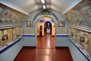 まず前半部分は展示室になっていて、写真のようにたくさんの展示があります。ポスターや小道具、当時のカメラに銃、そして潜水艦の図面も展示されています。歴史好きだけでなく建築や機械工学が好きな人にもたまらない展示となっています。