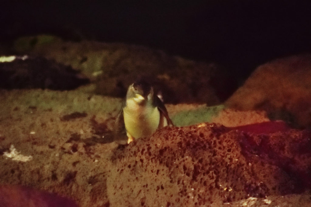 セントキルダ埠頭のカフェより先に進むと門があり、そこから先の岩場エリアがペンギンの巣になっています。そのためその門から先はフラッシュを使っての撮影が禁止されています。観光客がペンギンに影響を与えないよう係りの者が監視をしています。野生のペンギンは以外と警戒心がなく、普通に人の前を横切っていきます。かわいい姿をカメラに収めたいのですが、暗闇の中を常に動いているので中々難しいですね。