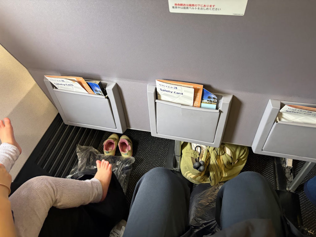 エコノミープラスの最前列は床に置いた荷物が届かないほど足元に余裕があり、子供を遊ばせるには十分なんです。