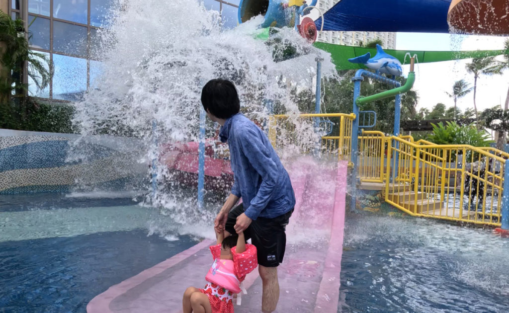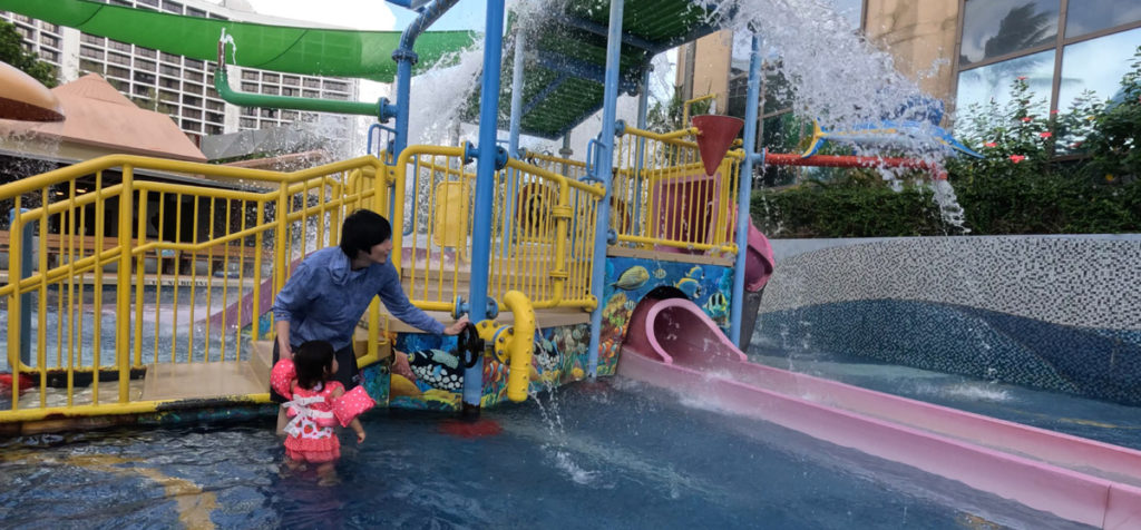 メインはやはりお隣のデュシットビーチリゾートにあるキッズプールですね。大人の膝下くらいの深さなので1歳児でも自力で歩けます。
